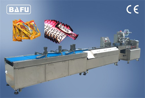This is a fully automatic machine with print registration and date printer, auto reject device for misplaced chocolates. Machine can be supplied different configurations of cutting jaws for different sized products. The machine wraps in the flow-pack style.