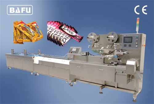 This is a fully automatic machine with print registration and date printer, auto reject device for misplaced chocolates. Machine can be supplied different configurations of cutting jaws for different sized products. The machine wraps in the flow-pack style.